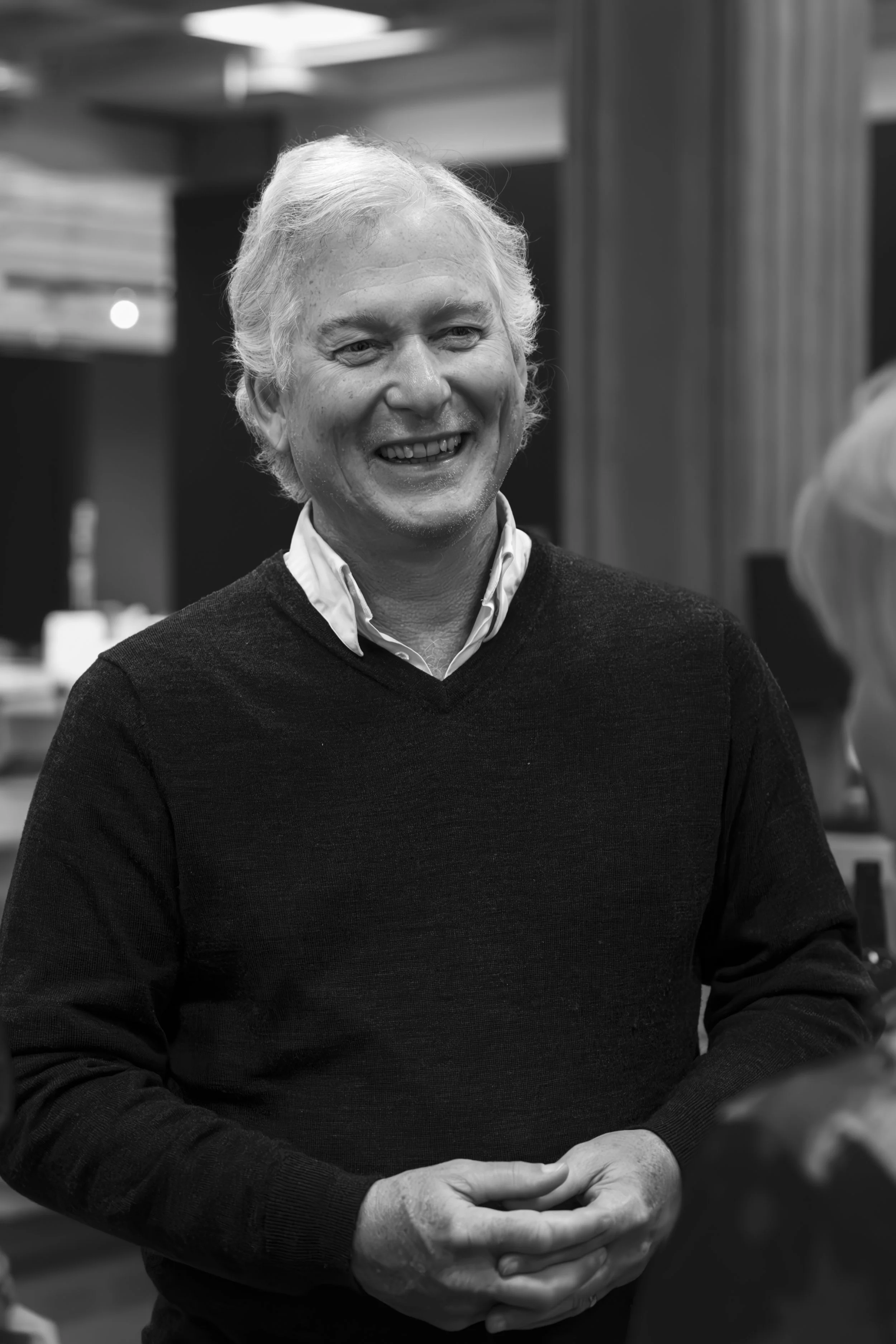 A black and white portrait of a man smiling mid-conversation as he clasps his hands together in front of him. He is attending the launch of the Better Banking event run by Community Networks Aotearoa in 2023.