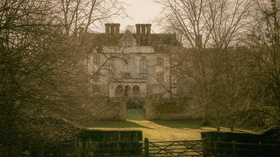 The image depicts Cranborne Manor in Dorset, a large white building surrounded by a fence and trees. The stately home is illuminated by golden mid-winter sunlight, creating a warm ambiance. The trees are adorned with dew drops on their branches, addi